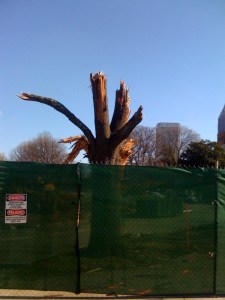 Someone should have warned the tree. This is on the Tech campus where, as I have written before, both good and unfortunate planning happens with regard to the environment. This work is being done on the back of the main library. I am not sure of the plans but the whole thing is fenced off and it’s signed as dangerous to humans, and obviously dangerous to old, huge trees. The progress is probably beneficial but the tree looks severely mangled.