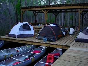 We stopped for lunch at a platform about halfway between the launch and our final destination. There we saw some other folks canoeing and got our first taste of what our digs would look like. The day was clear and beautiful so we were making use of all the sunscreen we brought but were only beginning to realize that the bug spray and DEET weren’t all that essential (of course it was only the middle of the day). We forged ahead through the second half. It seemed a bit longer and tougher as we were going against the current and the sun became more intense.