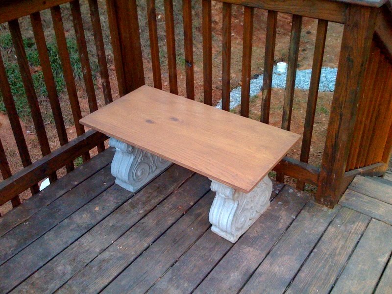 Like the bench the coffee table also finally met its demise. It sat out on the street for a day and a half with a sign that said “Free to a good home.” Then I defiantly went down, grabbed it, and brought it back up to the house; set on improving it to a state worthy of a permanent spot on our deck. My initial intention was to refinish the whole thing for outside use and find some new legs. But then I took it apart, cut the bottom layer in half, and finished it and the top separately. I used the half to make a bench top for the cement bench feet we had and with some new legs the original table top is now a stand alone table for the deck. I still have have a table to spare. I wonder what we’ll come up with for it.