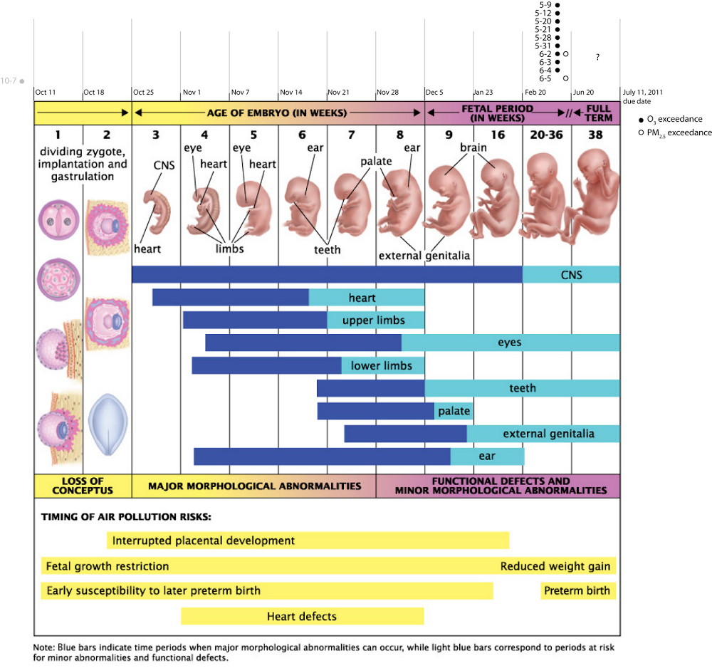 As the summer wears on, the poor air quality days are beginning to happen, and in succession. We’re currently in a long stretch of code orange smog alert days, which are forecasts of the air quality and do not actually represent an ‘exceedance’ under the Nation Ambient Air Quality Standards. With a baby on the way I am interested in how seasonal air quality affects development. I have superimposed our own pregnancy calendar and regional air quality onto the fetal development and air quality interaction chart from UCLA Institute of the Environment and Sustainability. I think that the chart may be more applicable to serious air quality concerns such as indoor smoke, but the exercise may still be interesting.